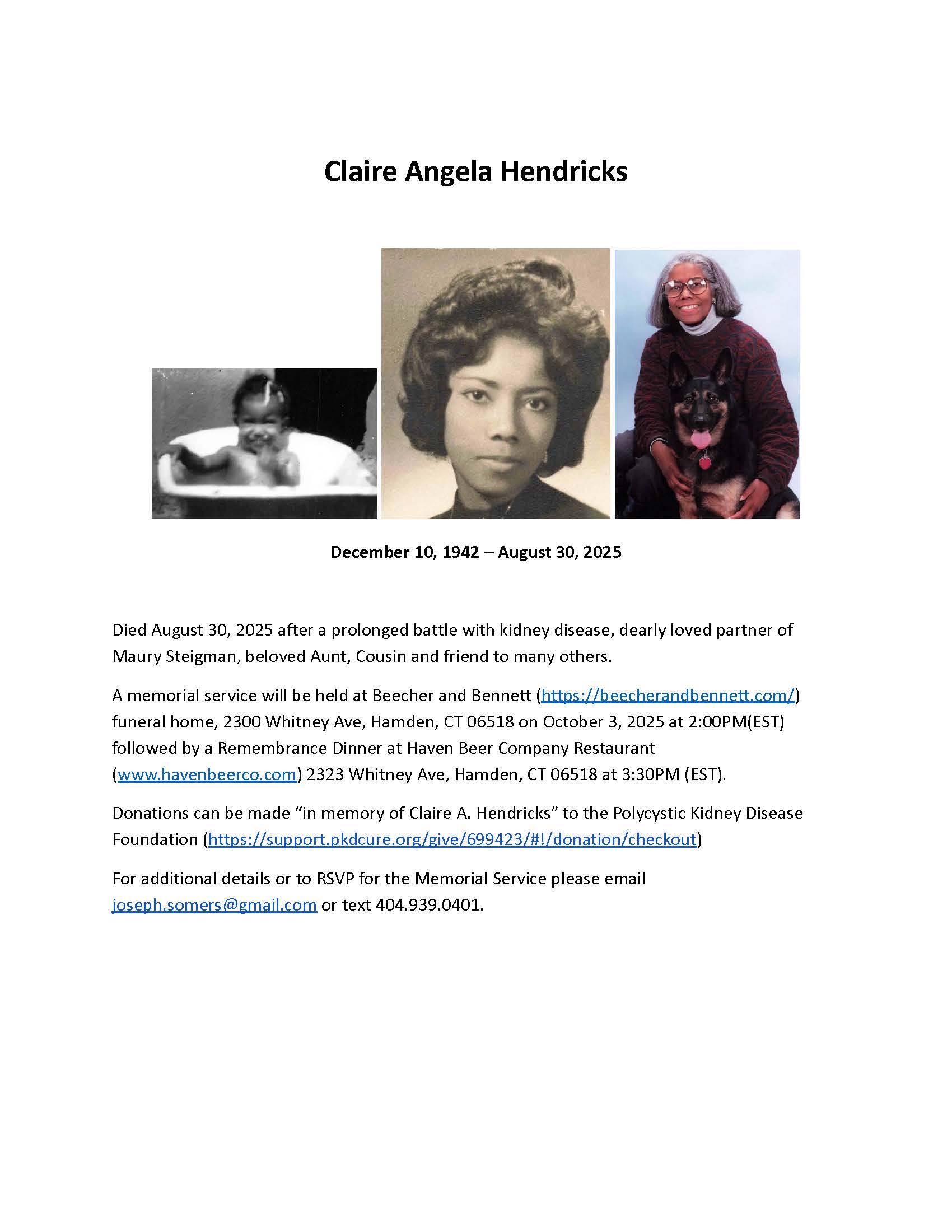 Claire Angela Hendricks, 82, of Hamden, passed away August 30, 2025. She was born December 10, 1942 in Jamaica to the late Frederick Jackson and the late Lilly A. Francis. She leaves behind her longtime companion, Maury Steigman of Hamden, and cousins, Joseph and Gloria Somers, Sr. of Miami, FL, Joseph Somers, Jr. of Atlanta, GA, Charles Somers of Huntingtown, MD, Alyson Somers of Miami, FL, Suzette Burgher, niece, Bermuda, and Richard Moore, Caroline Darton-Moore, and Derick Boyd, all of England.